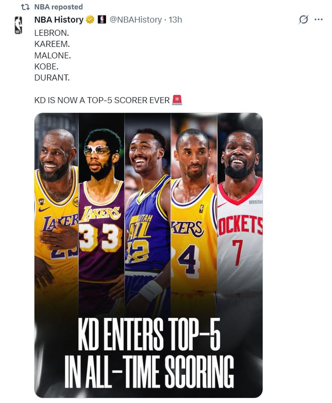 NBA新的历史得分榜前五:詹姆斯、贾巴尔、卡尔马龙、科比、杜兰特。37岁的杜兰特要超41岁的勒布朗难度就非常大了,杜兰特才32294分,而勒布朗已经43241分。